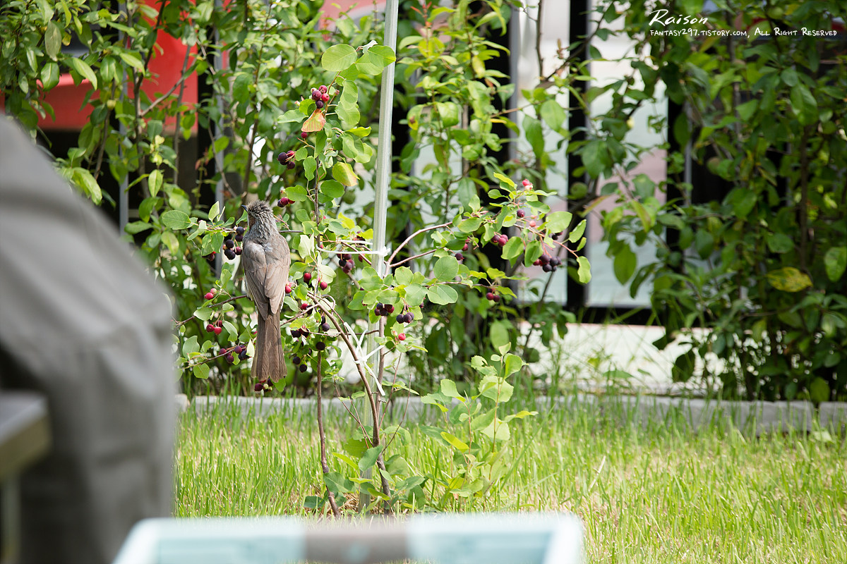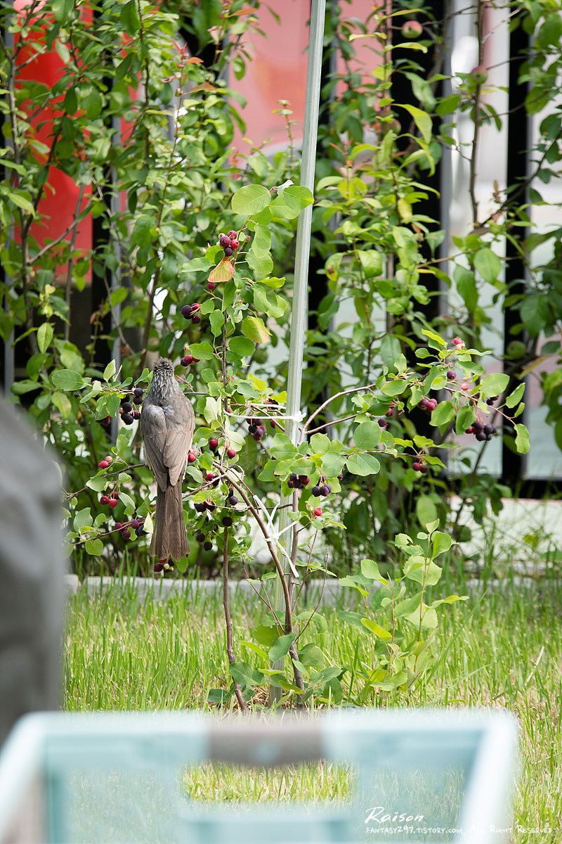 딱새 부부(?)가 마당에서 한동안 놀고 난 뒤 우리 집의 불청객 시끄러운 직박구리 녀석이 찾아왔습니다.