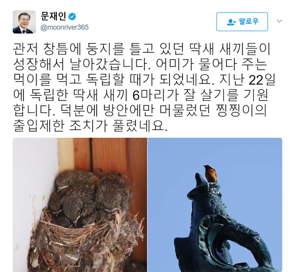 인터넷에는 '화질구지'와 문재인 대통령 당선일에 태어난 청와대 '딱새'로 유명하더군요