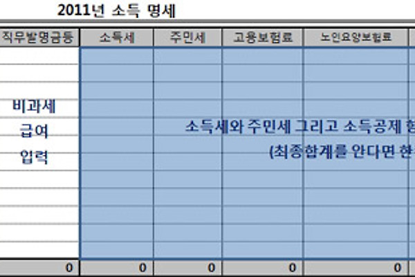 올해도 어김 없이 연말정산의 시기가 왔습니다. 스마트폰 앱이나, 각종 포털에서 운영하는 프로그램등이 잘 되어 있음에도 불구하고.. 인간이 후져서.. 엑셀로 계산하는게 아직까지 편해 올해도 만들어 봤습니다... 작년 대비 올해는 크게 바뀐 게 없네요.. 2011년 연말정산 무엇이 바뀌었나? 1. 다자녀 소득공제 한도 확대 두자녀가 50에서 100만원으로, 3자녀이상은 1인당 100만원에서 200만원 으로 확대 되었습니다. 2. 기부금 공제대상 확대 올해부터 부모님이나 형제자매가 기부한 금액도 공제 대상이 됩니다. 그리고 종교단체외의 기부금 한도가 근로 소득 금액의 20%에서 30%로 확대 되었습니다. ※ 근로 소득금액의 30%를 기부하는 직장인이 얼마나 있을런지 의심이 되긴합니다. 3. 퇴직연금,연금저축 ..